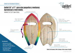 En Colibrí Surf fabricamos los handboards – handplanes con madera de Paulownia. Hacemos varios acabados de tablas para bodysurf de 12″ 16″ y 17″ en las que varía el grip y el tail. Este influye levemente en el surf, es más una cuestión de gustos. Los diseños del shape, tamaños y proporciones, son el fruto de muchas pruebas de deslizamiento y barrenas en distintos tipos de ola en las playas del norte de España y Portugal.